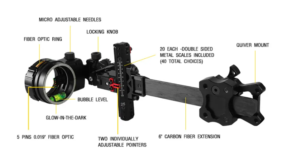 - 5-Pin Fiber Optic Sight: High-precision 0.019" fiber optic pins for enhanced accuracy in various lighting conditions.